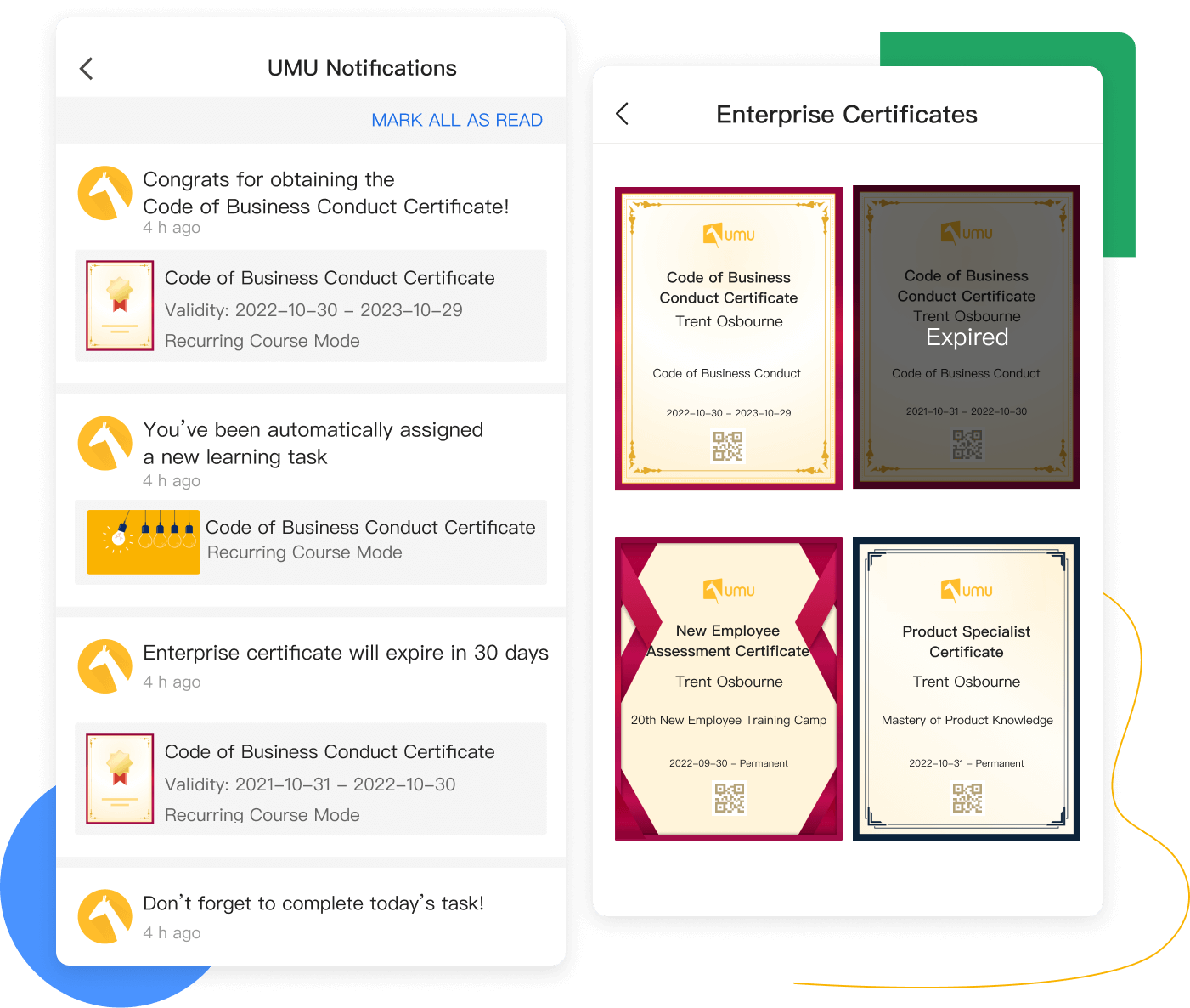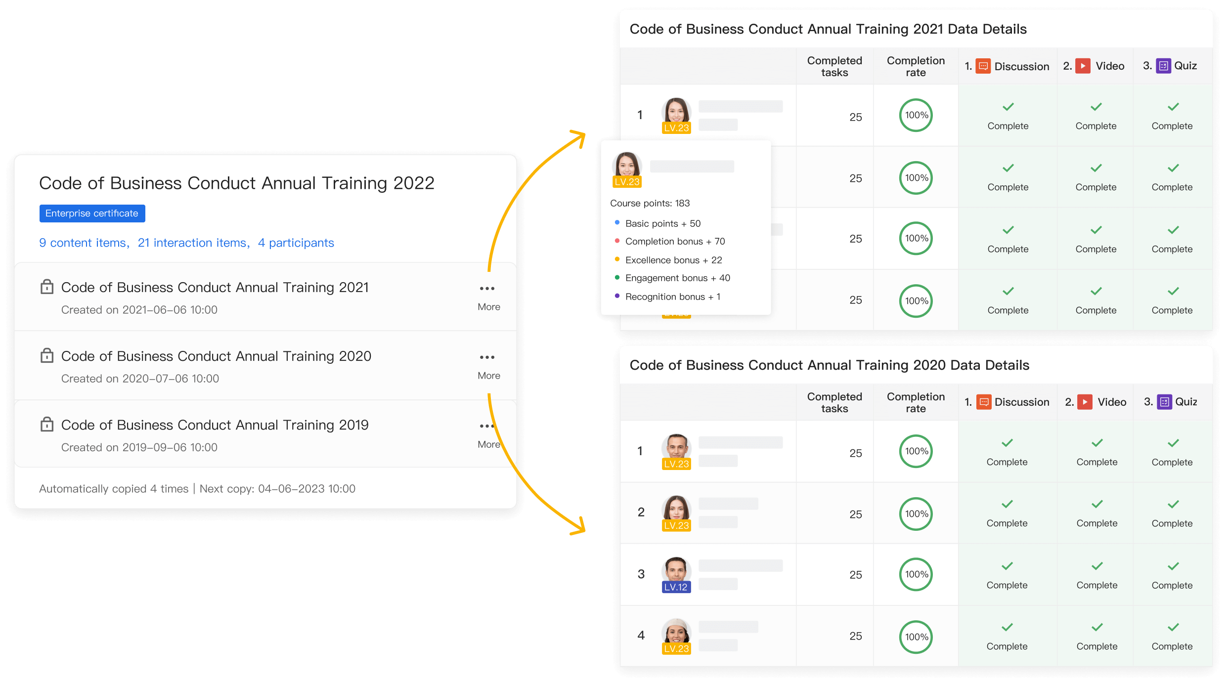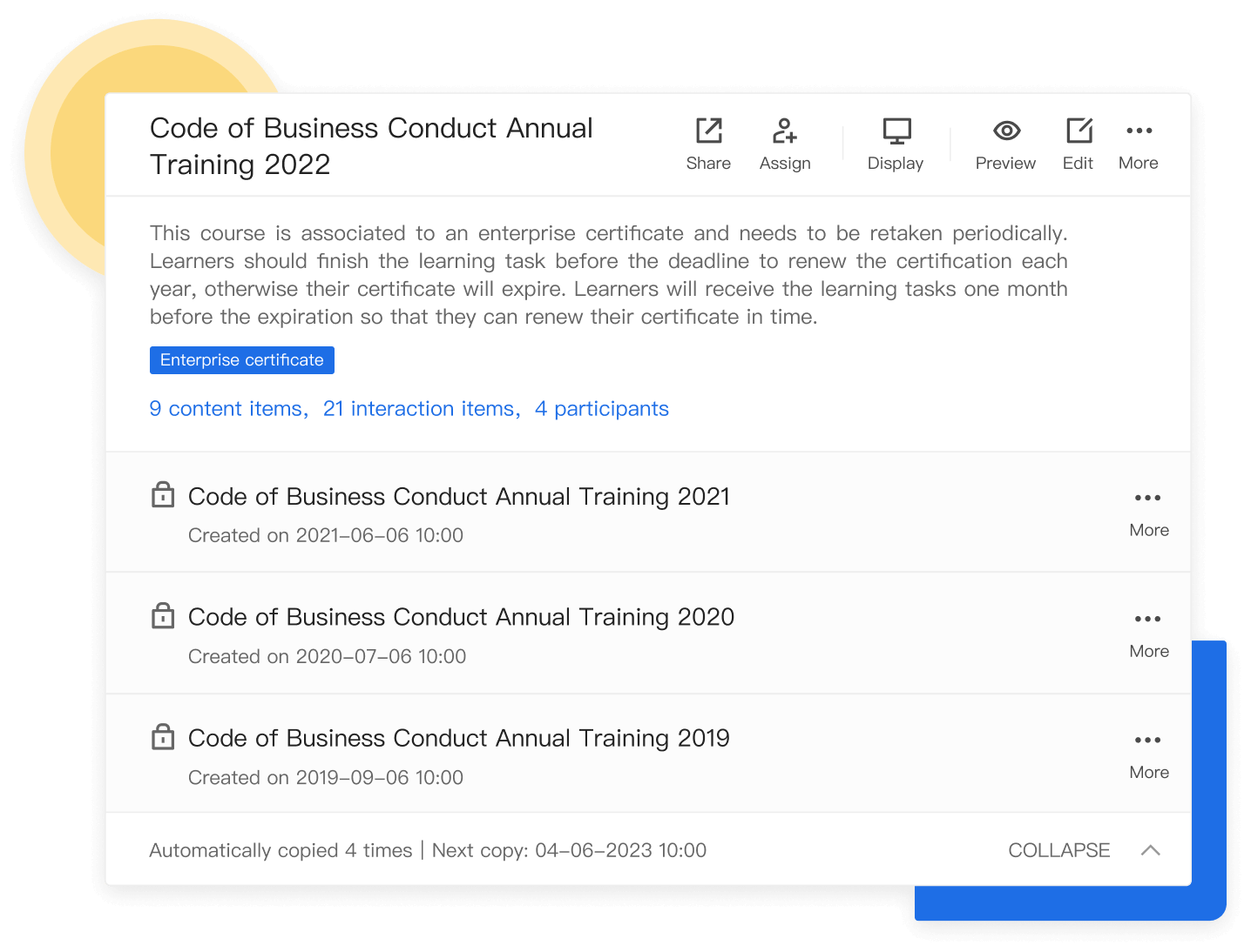 Once learners complete a recurring course, a new Enterprise certificate will be issued and the old one will automatically expire, ensuring only one valid Enterprise certificate.